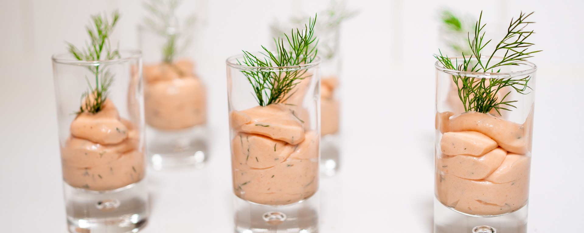 Salmon mousse is a festive appetizer that is delicious yet easy to prepare. The only equipment you need is an immersion blender. You can serve it in small glasses like I did here, but it is also excellent for canapés: cut out round pieces of bread, toast them, and place some salmon mousse on top.