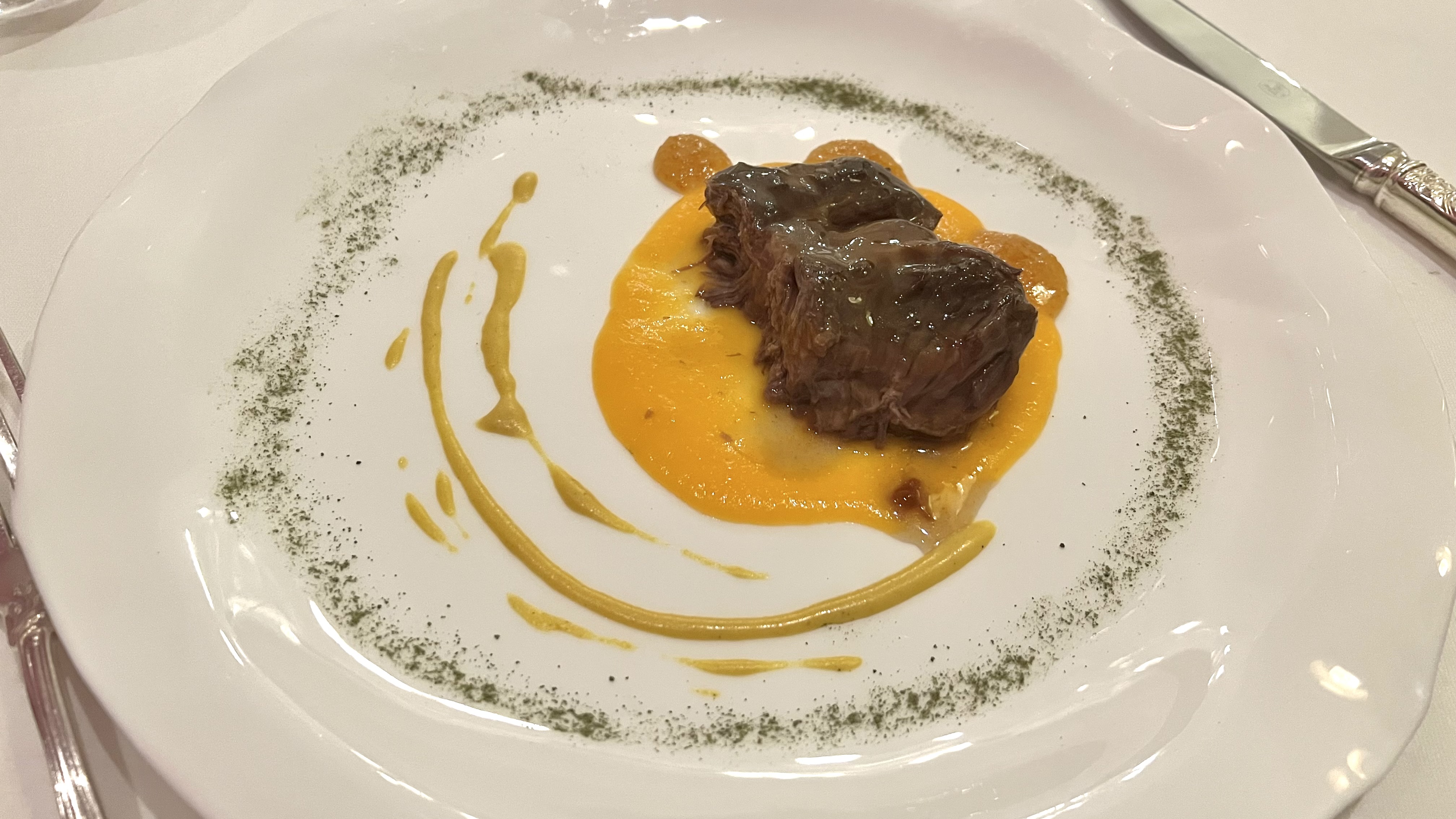 The wine was accompanied by the meat secondo: braised blade steak, marinated with oriental spices and served with a squash velouté, orange mostarda, wasabi, and borage powder. The meat was very tender and by itself a nice pairing with the wine. The mostarda, squash, and wasabi were nice with the beef, but not helping to bring out the best of the wine.