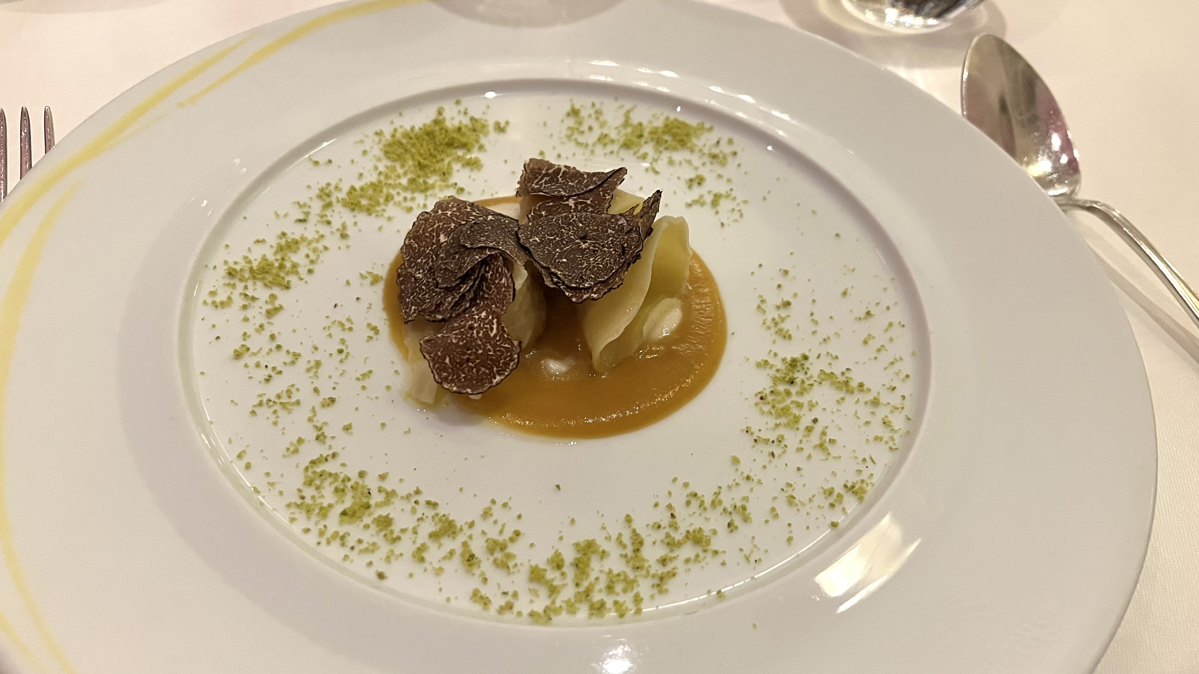 Next were cappelli (a type of ravioli) of regular fresh pasta, stuffed with chicken, and served with onion, parmigiano, and a generous serving of black truffle. This was paired nicely with a Semillon from Chile that was made somewhat like an orange wine, but not in an oxidative style (so it was very nice). The pasta with truffle was just wonderful.