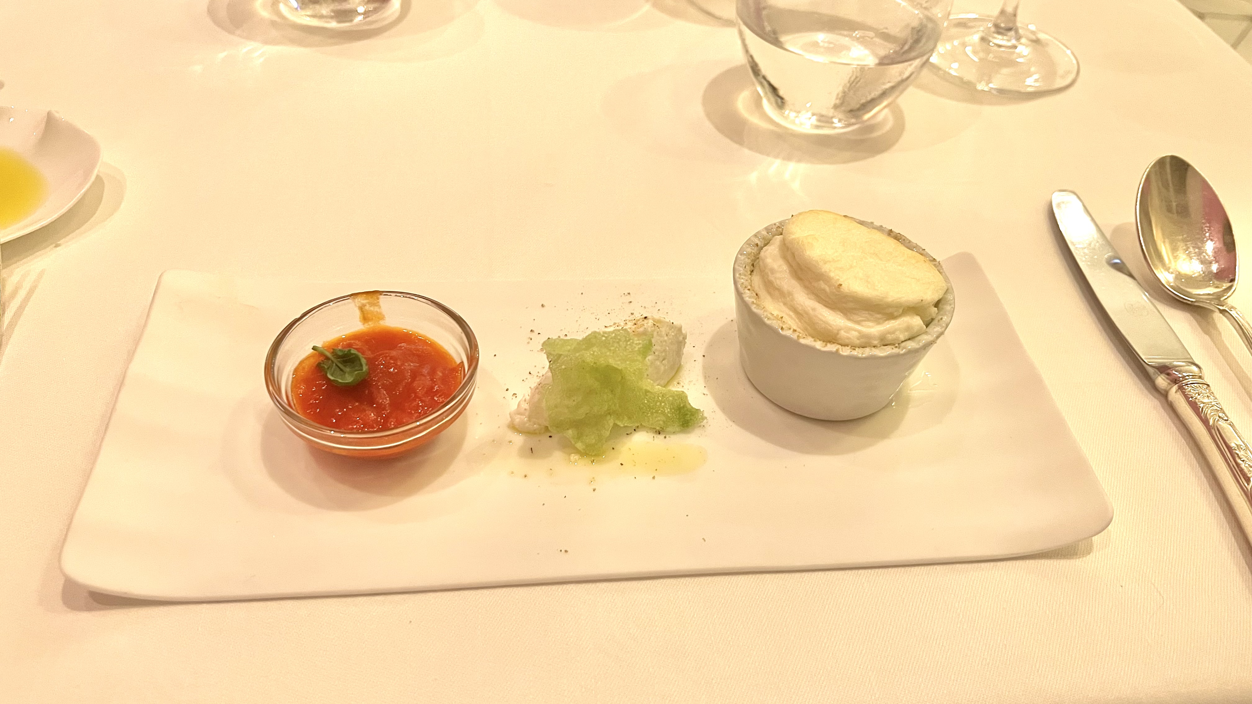 The first course of the menu was buffalo mozzarella soufflé and mozzarella ice cream with tomato coulis and crispy basil. A classic combination of ingredients from this region, served with a contrast between hot and cold. It was paired nicely with a Viognier from Lazio.