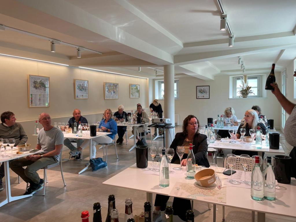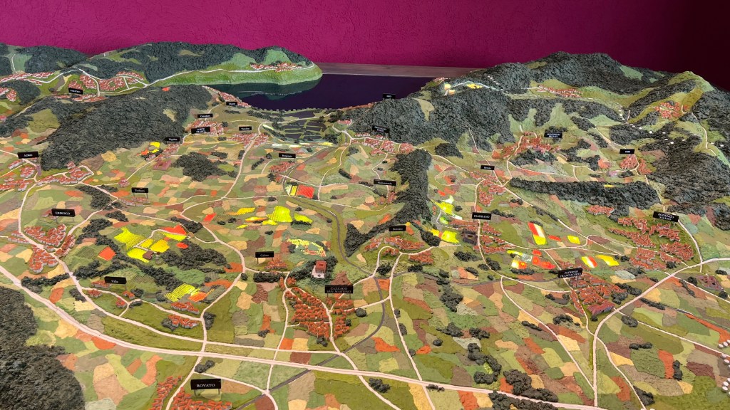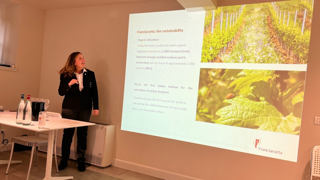 Our first stop in Franciacorta was at the Consorzio per la tutela del Franciacorta in Erbusco, where a representative of the Consorzio gave us an introduction to Franciacorta. The name “Franciacorta” can refer to the wine, to the production area, as well as the production method. Which is again the metodo classico, just like in Champagne and Oltrepò Pavese, with a second fermentation in the bottle. The minimum aging period on the lees for Franciacorta DOCG is 18 months, which is longer than Champagne (15 months). Franciacorta does not have a long tradition for Italian standards, as the first Franciacorta was produced in 1961. It has held a DOC denomination since 1967, and was upgraded to DOCG in 1995. Franciacorta is a small production area, with only 3000 hectares of vineyards. The word means “free courts”, and refers to the historic freedom of duties in the 11th century.