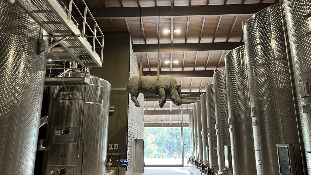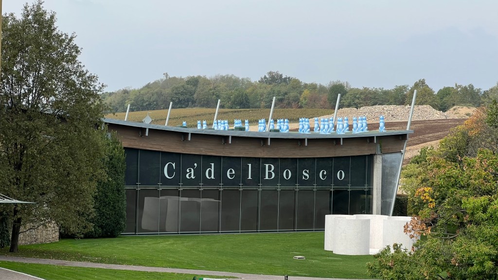 The first winery we visited in Franciacorta was Ca’ del Bosco. The winery is located in an impressive park with a long driveway. It has 268 hectares of vineyards, mostly Chardonnay, but also Pinot Nero and Pinot Bianco. They produce 1.8 million bottles per year, of which 1 million of their ‘work horse’, the Cuvée Prestige.