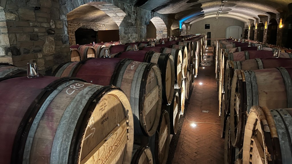 Ca’ del Bosco has its own barrel maker in France, where oak from Allier is used and seasoned for 3 years. They produce both barriques (225 litres) and pièces (228 litres). The new barrels are only used for the still wine (Curtefranca DOC), never for Franciacorta. Barrels are used for 4-5 times before they are replaced.