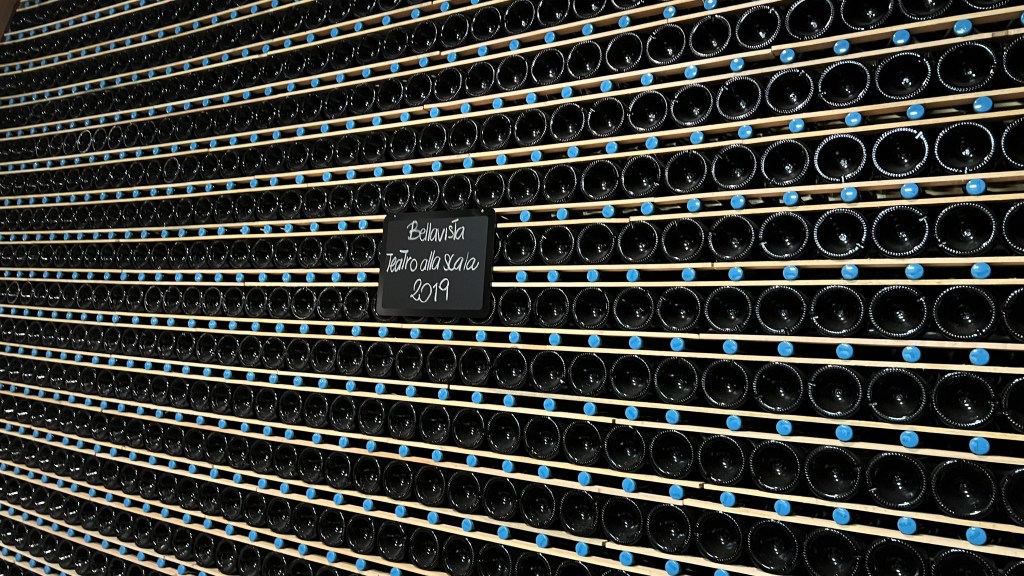 Riddling is only done by hand for large formats (magnums etc.); for the regular bottles gyropalettes are used. A final touch to preserve the aromas (reduce oxidation) and reduce the amount of sulfites is to add nitrogen at the disgorgement, a patent of Ca’ del Bosco.