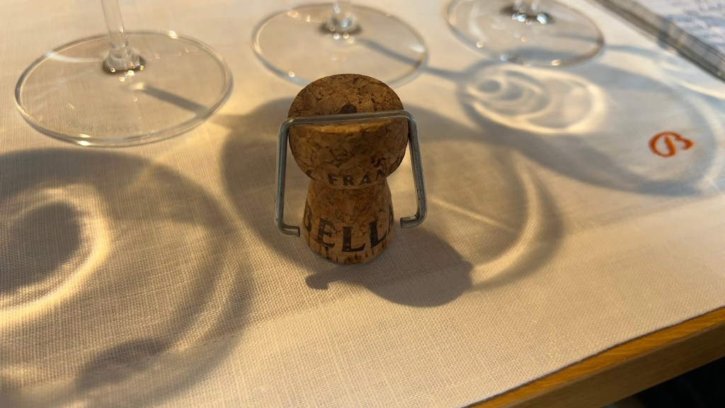 - Monterossa Brut Cabuchon, 70% Chardonnay, 30% Pinot Noir, fermented in oak, 36 months on the lees, dosage 5 g/l. Because of the fermentation of the base wine in oak, this wine was in a more oxidative style.