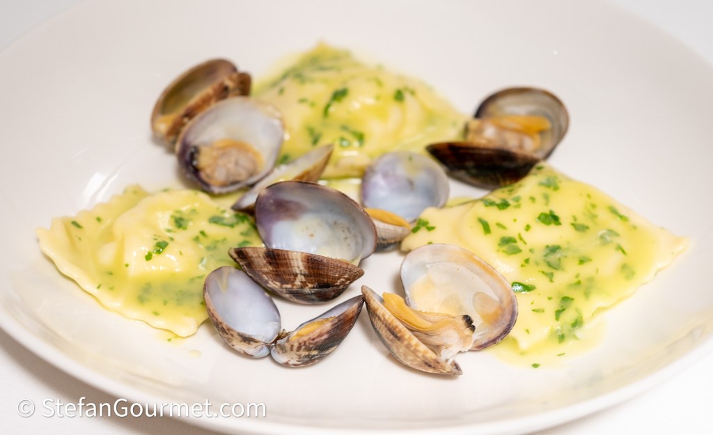 This dish was inspired by the ravioli we had at Lo Stuzzichino during our latest vacation to Italy: ravioli filled with ricotta perfumed with lemon zest, served with vongole. Although making your own ravioli from scratch requires some practice, this is otherwise a simple dish with only a few ingredients. To dress the ravioli I decided to make an emulsion of the clam juices with extra virgin olive oil and parsley, and that worked very well.