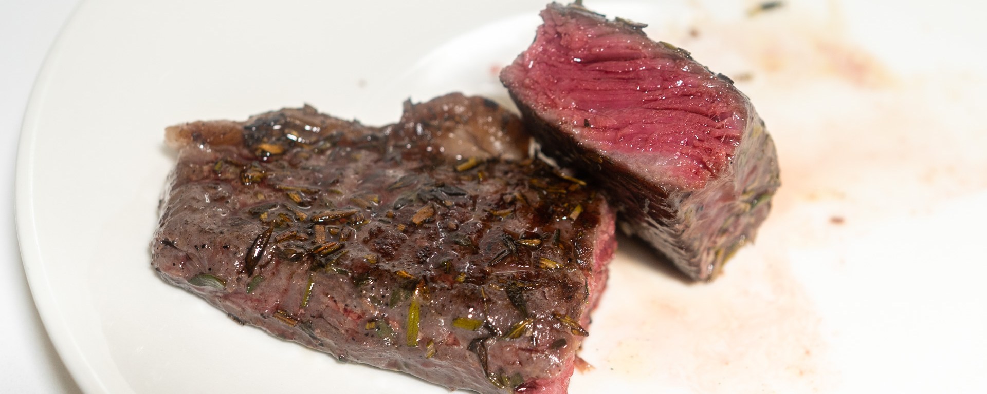 For each strip steak: 2 teaspoons of fresh thyme leaves, 2 teaspoon of fresh rosemary leaves, salt, freshly ground black pepper, olive oil.