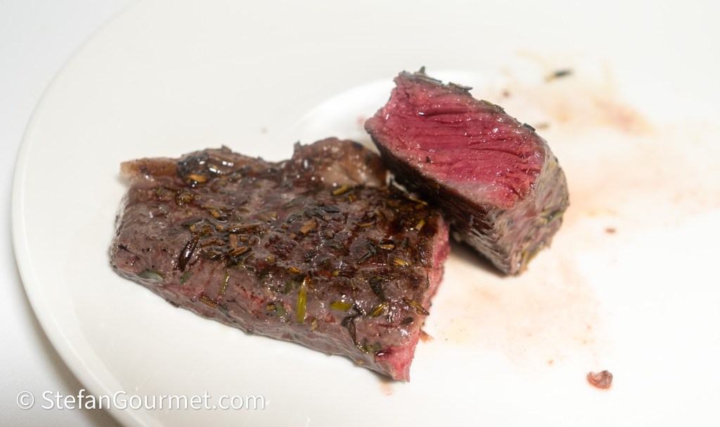 Season the steaks on both sides with salt and freshly ground black pepper. Then place the steaks in a plastic bag for sous vide, and distribute a teaspoon each of thyme and rosemary on each side. By adding the herbs inside the bag, the herbs won’t fall off. Then vacuum seal, and allow the salt to penetrate into the meat for at least a couple of hours (or overnight) in the refrigerator. Then warm age the strip steaks in the sous vide for 3 hours at 45C/113F.