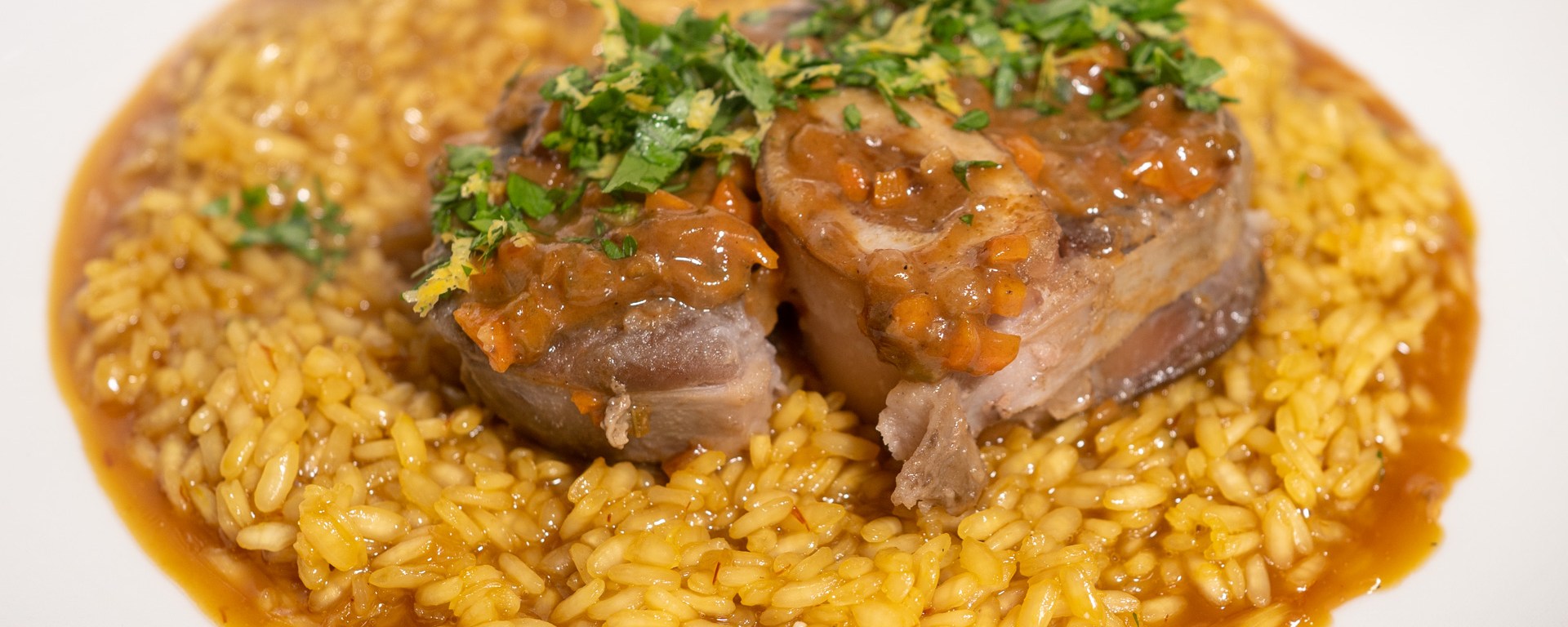 Ossobuco is garnished with gremolata, a mixture of minced fresh flat leaf parsley, garlic, and grated lemon zest.