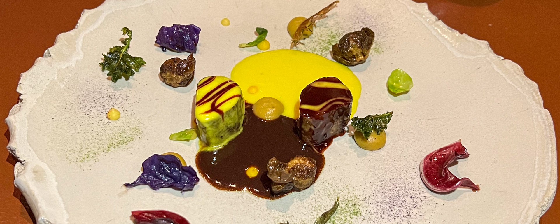 It was an excellent pairing for the langoustine ceviche, which was ‘cooked’ in fermented cabbage juice and finished tableside on a hot stone with mushroom powder.