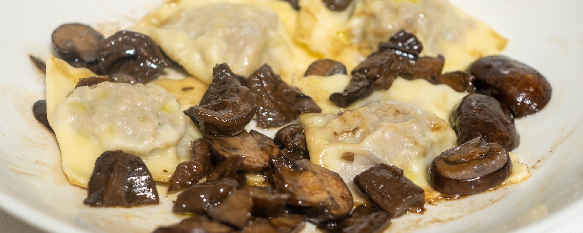 Meat that comes from a muscle that has done a lot work during the animal’s life is the most flavorful. Cheeks are one of the best examples. In this recipe, wild boar cheeks are first cooked sous vide and then pulled for the ravioli filling. The juices that are released by the meat during the sous vide cook will be mixed with the pulled meat, such that not a single drop of moisture or flavor will be lost. Although making your own ravioli from scratch takes some work, this is a simple recipe. The sauce consists of mushrooms, enhanced by using the soaking liquid from the dried porcini mushrooms. This gives them an extra woodsy aroma and flavor.