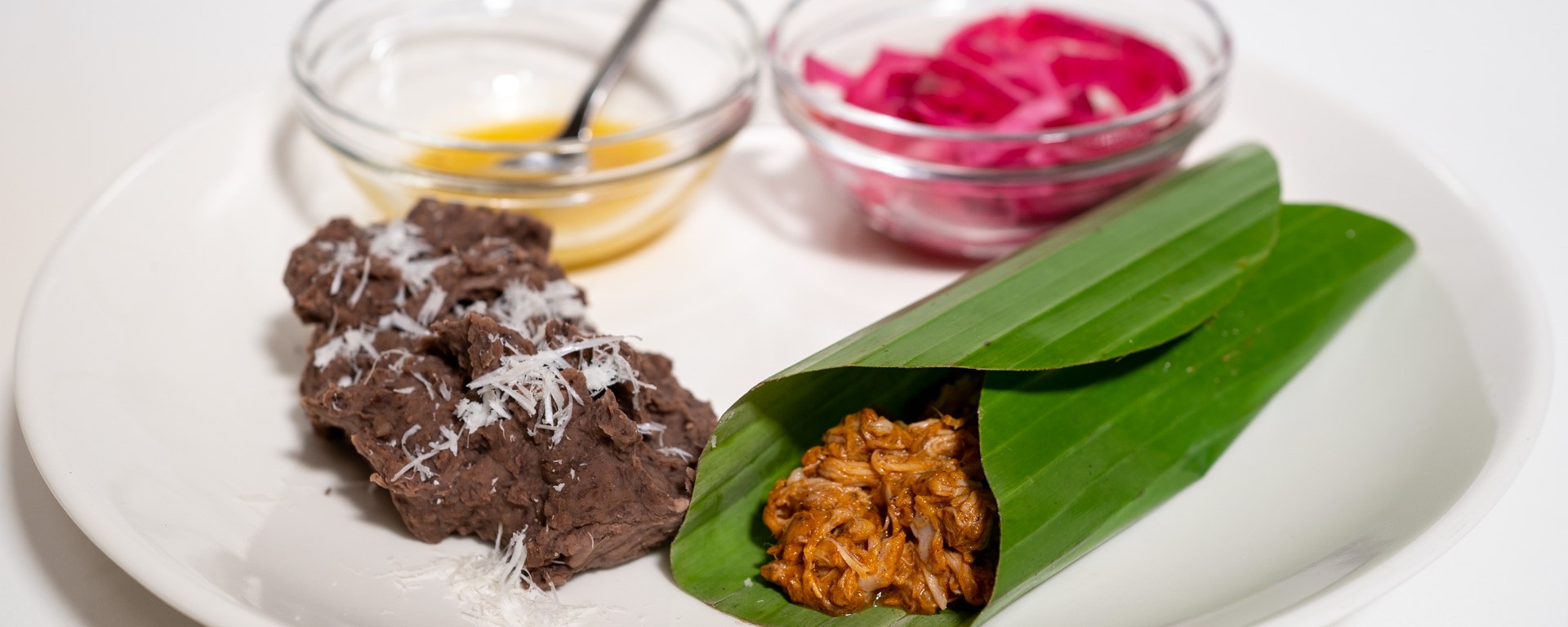 Serve the cochinita pibil with pickled onions, habanero salsa, refried beans, and warm corn tortillas.