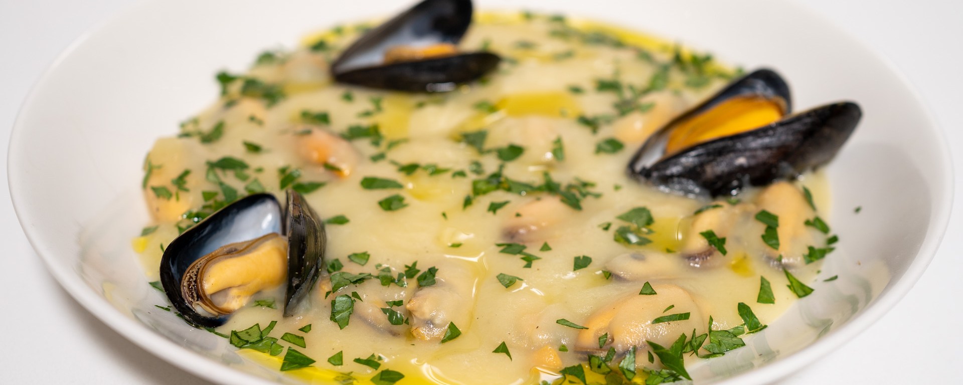Serve the velouté on preheated plates, garnished with mussels in their shells and parsley, and drizzle with high quality extra virgin olive oil.