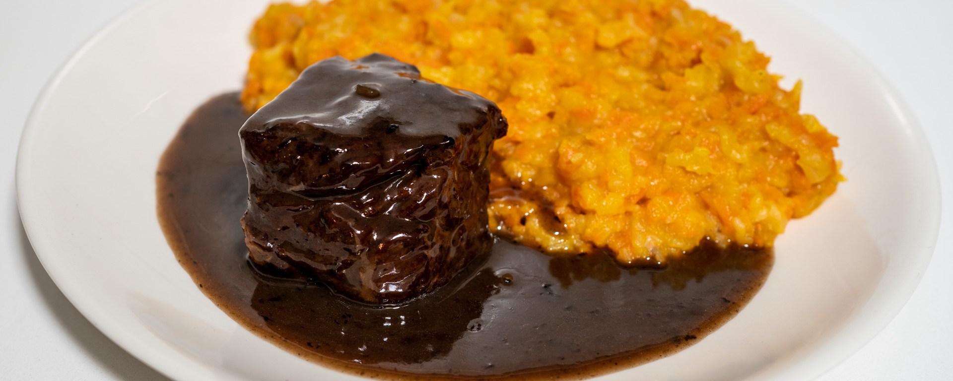 Dutch cuisine does not have a great reputation like Italian or French cuisine, but the comfort food Hutspot met Klapstuk can be taken to the next level by preparing it sous vide. Hutspot, literally hotch-potch, is carrot, onion, and potatoes, all boiled together and then mashed. By braising the onions in beef fat until slightly caramelized and cooking the carrots and potatoes sous vide, the flavor and texture are enhanced. In the traditional method, a lot of the flavor is literally poured down the drain when the cooking water is discarded after boiling the vegetables.