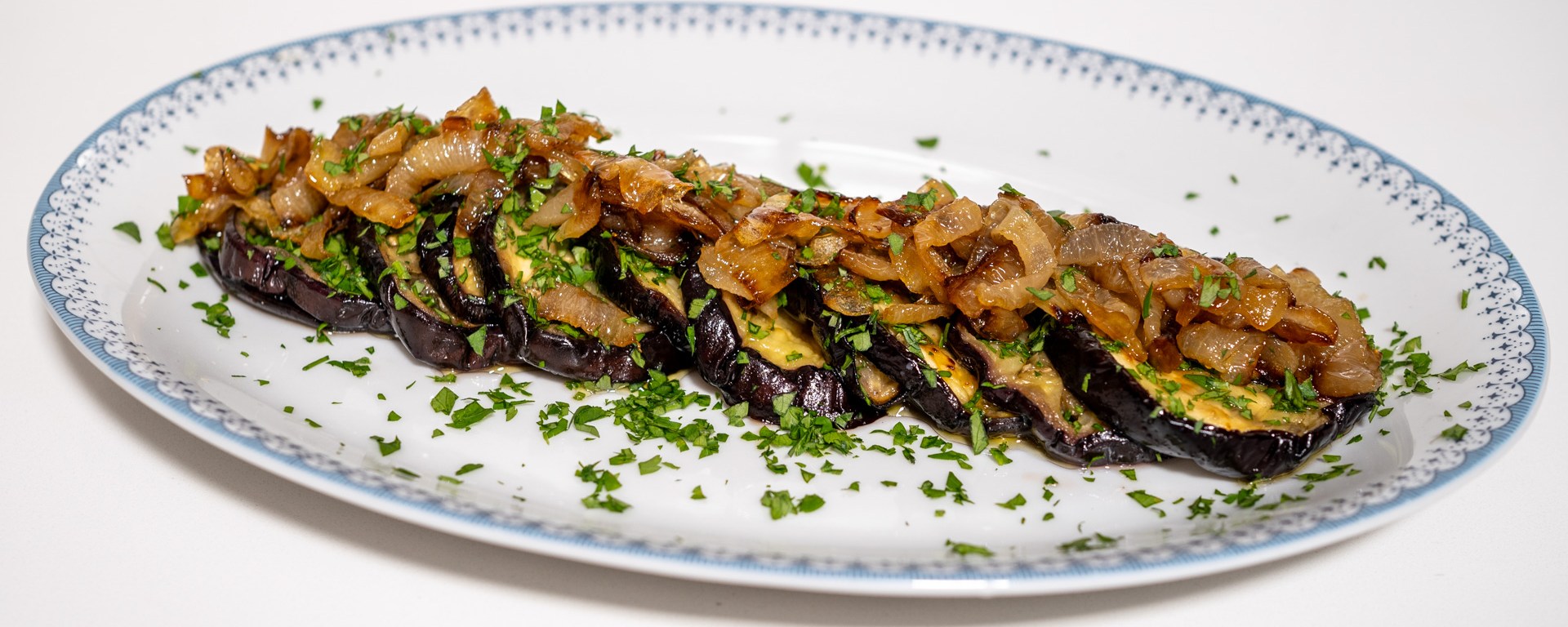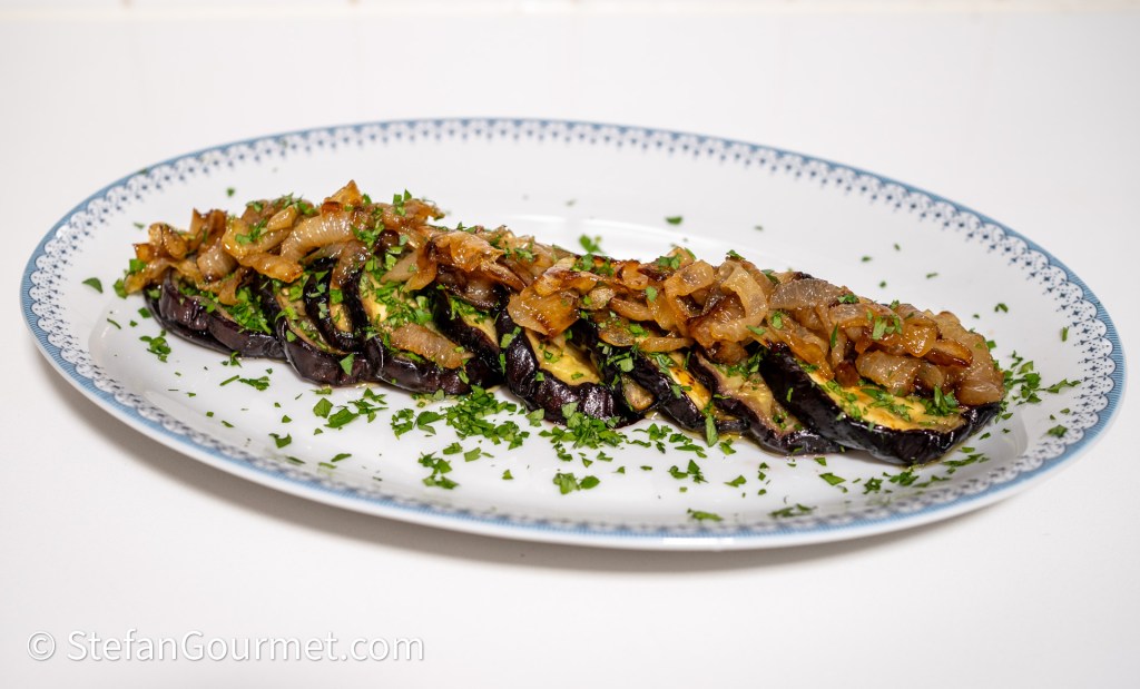 Serve the eggplant with the caramelized onions on top, sprinkled with minced parsley and drizzled with good quality extra virgin olive oil. Grind some black pepper on top. This dish is served at room temperature.
