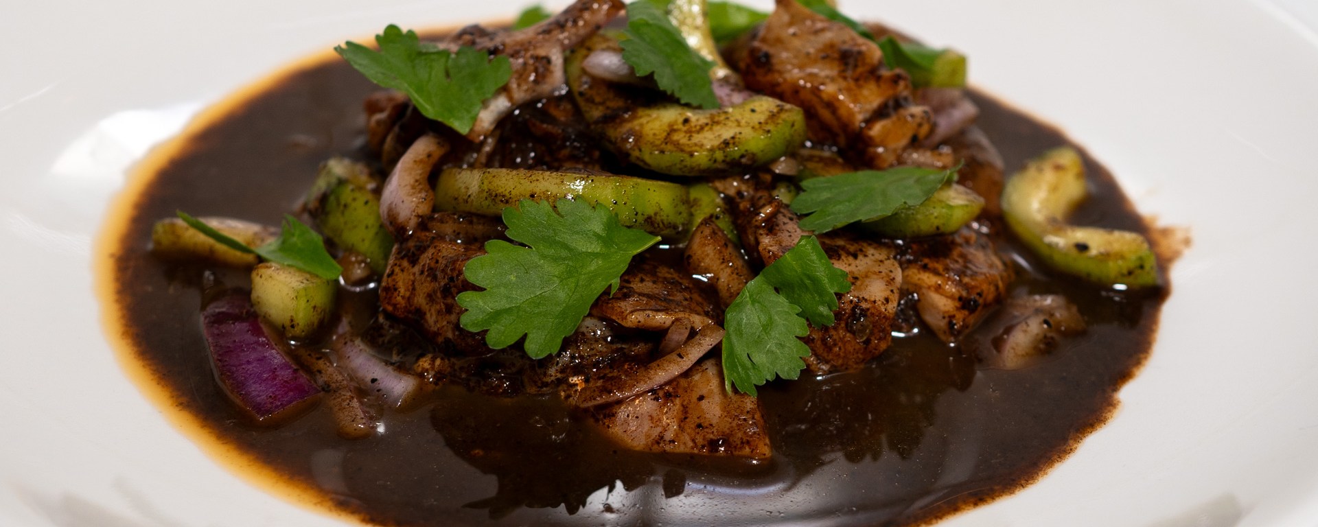 Ceviche was often on the menu in restaurants during my trip to Yucatán, Mexico. Ceviche is raw seafood that is ‘cooked’ by marinating it in citrus juice. What surprised me most when I ordered it in Yucatán, was that it was black in color. The black color can be from a ‘fusion’ ingredient like soy sauce or Maggi seasoning, making it more like a Peruvian fusion dish called tiradito. But it can also be from the black seasoning used in Mayan cooking in Yucatán called recado negro, which is also used to make Relleno Negro. And of course the juice of Seville oranges should be used, the ubiquitous ingredient in Mayan cooking. Raw shrimp also seemed to be a constant factor in Yucatese ceviche. The result is a wonderful ceviche with a delicious and original flavor from the charred ingredients in the recado negro. In Mexico ceviche was served with tostados, toasted corn tortillas, on the side.