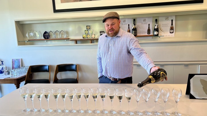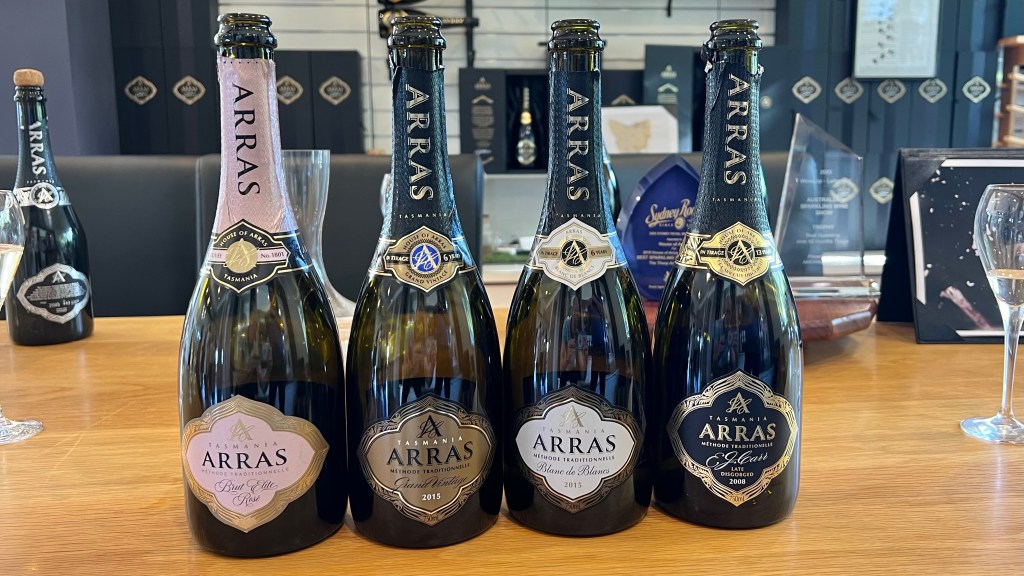 Grapes from all over Tasmania are used, sourced from multiple growers, and vinified and blended at the winery in the North. The name refers to medieval tapestries, as the wines are weaved together from many parcels. Arras specializes in late disgorgement, which means a long time of aging the wines on the lees. The high natural acidity gives the wines longevity, so they can be disgorged up to 16 years after the harvest. They do trial disgorgements to figure out when a wine is ready to be disgorged and how much residual sugar needs to be added to balance out the acidity. The long time on the lees provides creaminess through autolyse of the yeast, so a few grams of sugar suffices to get a balanced result.