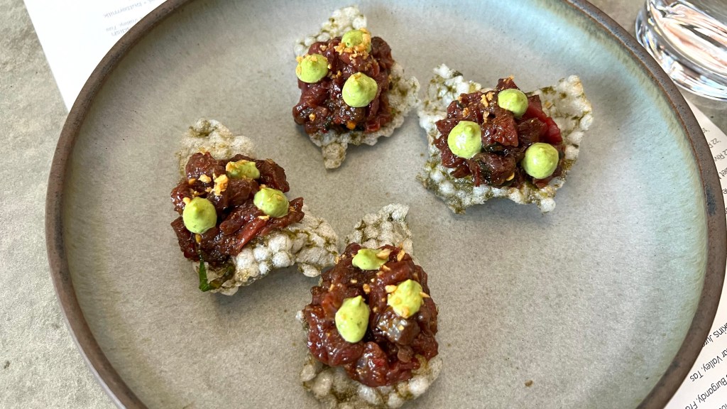 The appetizers came in two sets of three. The first one consisted of wallaby tartare with sichuan pepper on a crispy tapioca cracker…