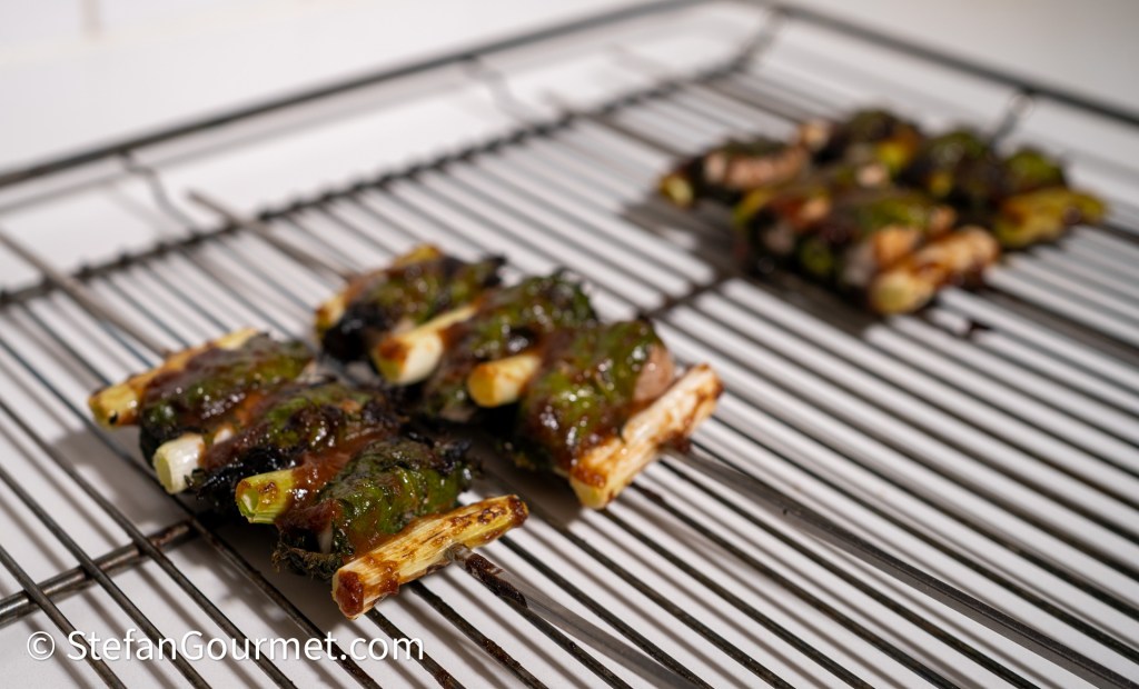 Note added on November 10, 2024: the chicken cooks more quickly than the scallions, so the scallions can be a bit too crunchy. To improve this, vacuum seal the prepared scallions, and cook them sous vide for 30 minutes at 85C/185F. Then chill them in cold water.
