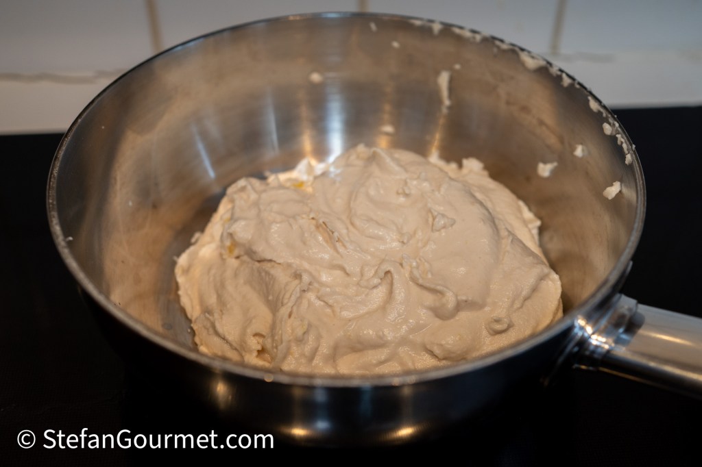 Blend to turn this into macadamia butter, adding warm water as needed to get the right texture. Taste and adjust the seasoning with salt and freshly ground white pepper. Transfer the macadamia butter into a saucepan to heat it up over low heat, stirring.