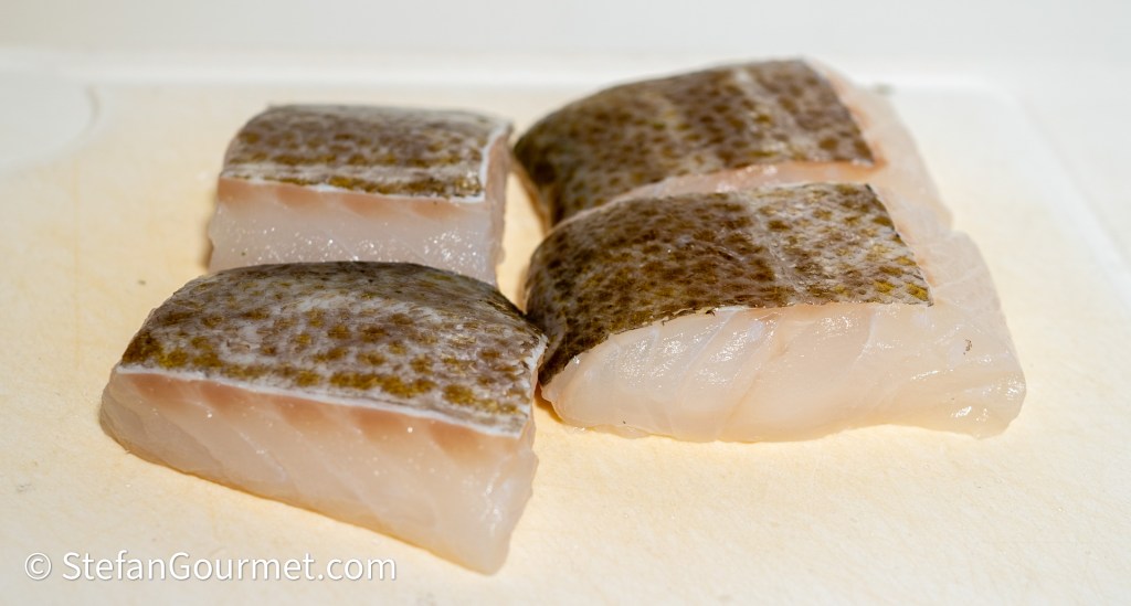 - 600 grams (1.3 lbs) cod or other white fish, in 4 portions