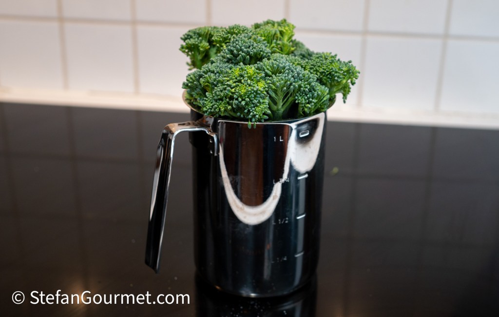 In the meantime, blanch the stalks of the broccolini for 2 minutes. A high narrow pot works best for this, as you want to keep the tops out of the boiling water.