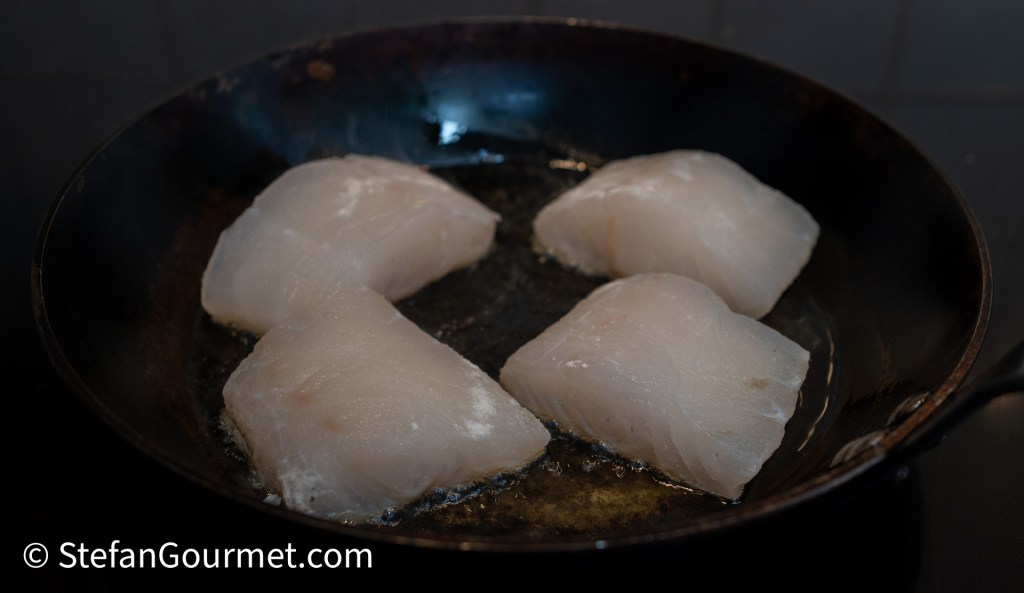 Fry the fish on the skin side only in clarified butter or olive oil over high heat.
