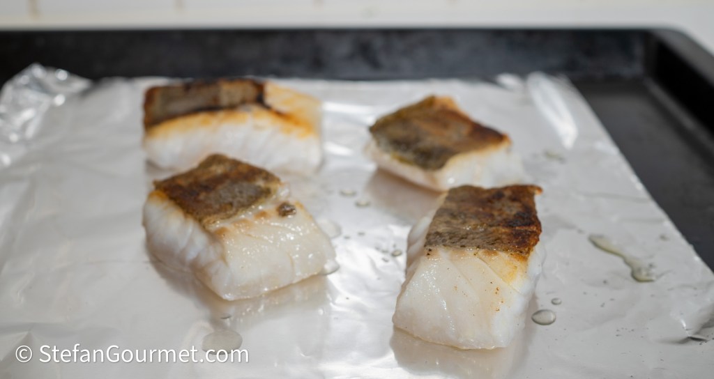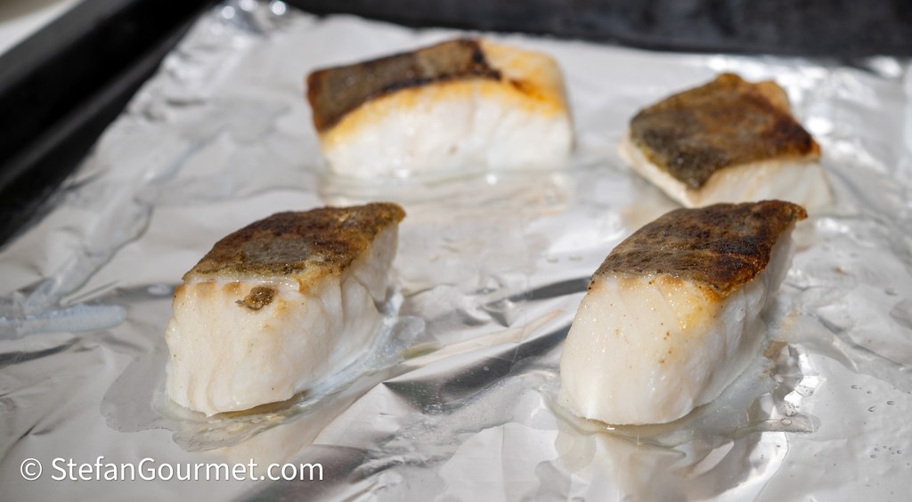 Once the skin is golden brown and crispy, transfer to a baking sheet lined with aluminum foil. Use an instant read thermometer with a probe, and insert it such that the tip of the probe is in the center of one of the pieces of fish.