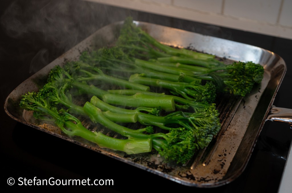 Brush a griddle plan with olive oil and heat it up well. Grill the broccolini until there are nice grill marks on both sides.