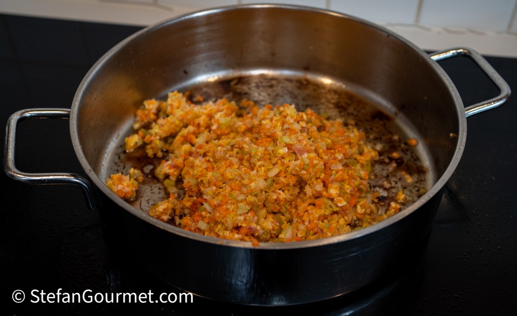 …but add the minced onion, celery, carrot, and lardo to the pan with the drippings from browning the oxtail.