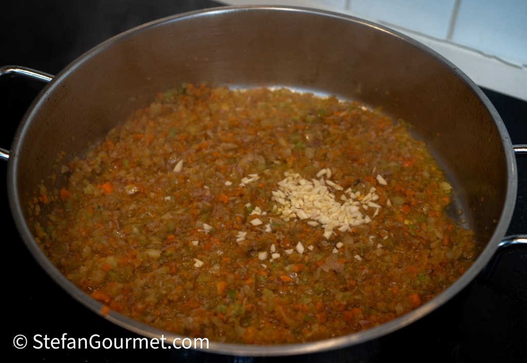 Stir over medium-high heat until the vegetables are dry and stat to turn golden brown, then add the minced garlic.