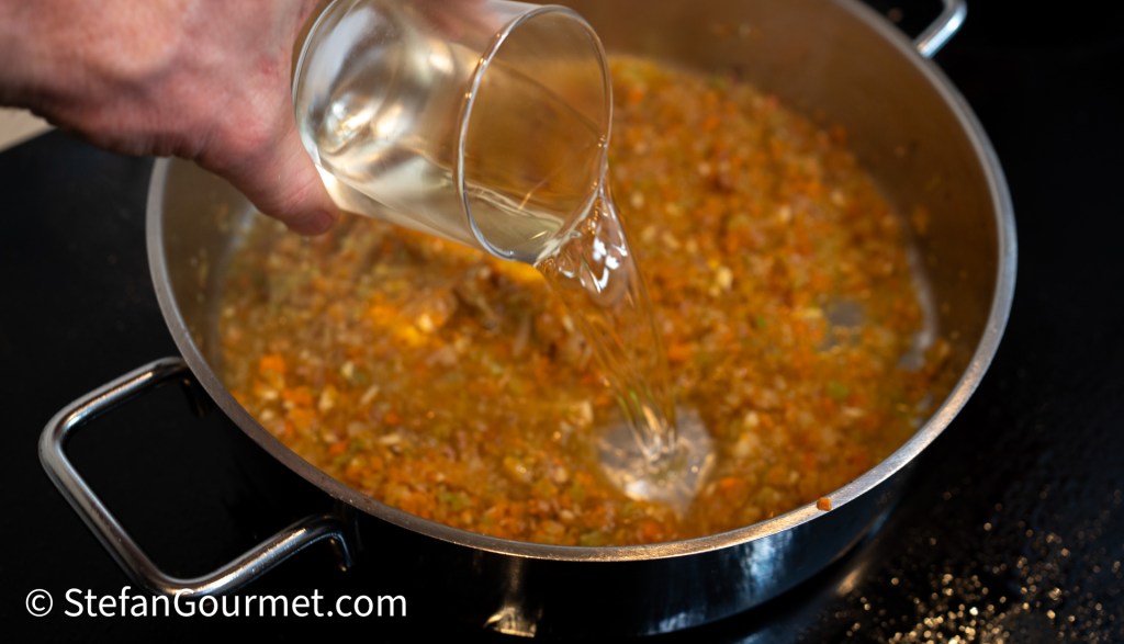 Scrape with a wooden spatula to get all of the flavor stuck to the pan into the sauce, and allow the wine to be reduced.