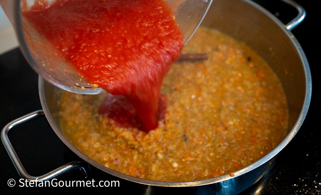 - 1 can (400 grams/14 oz) peeled tomatoes, pureed in the food processor