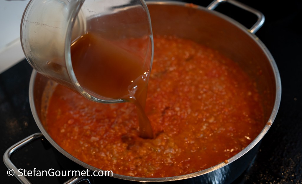 Add the beef stock, if using. If you are going to use the bones from the oxtail to make stock, it is not really necessary to add more beef stock.