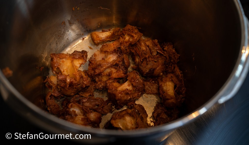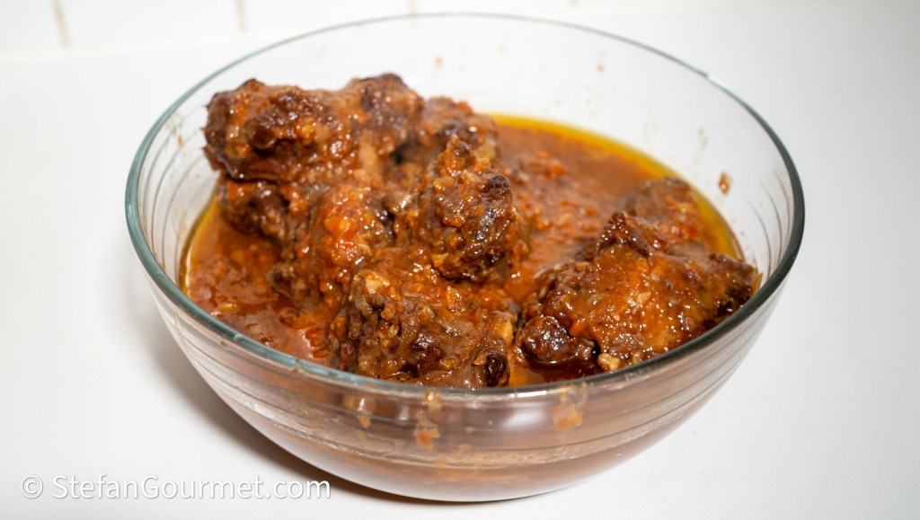 Then cook the oxtail sous vide for 24 hours at 74C/165F. (You could also cook it for longer to make it easier to separate the meat from the bones and connective tissue, or cook it for 4 days at 60C/140F to keep the meat medium rather than well done. But I don’t think that is worth the long cooking time for this preparation as the meat is chopped and mixed with the sauce anyway.)