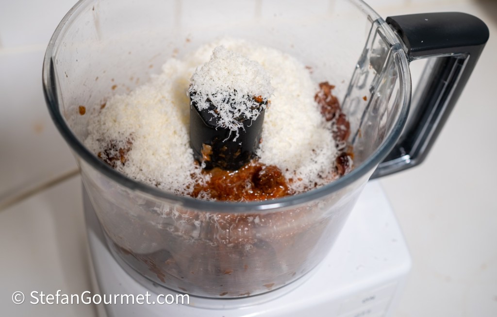 Combine the meat you picked off the bones in a food processor together with a ladle (about 1/2 cup or 120 ml) of the sauce and 50 grams of freshly grated pecorino romano cheese. Instead of adding the sauce, you could also add some of the concentrated stock.