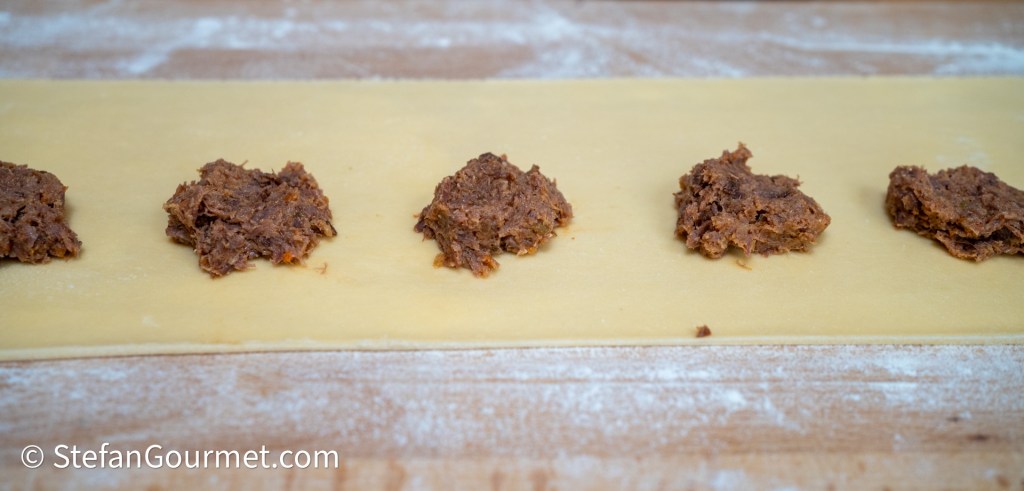 Transfer the filling into a bowl, cover, and refrigerate for at least half an hour to allow it to firm up. Make fresh pasta dough using my instructions, and allow that to rest for at least half an hour in the refrigerator as well.