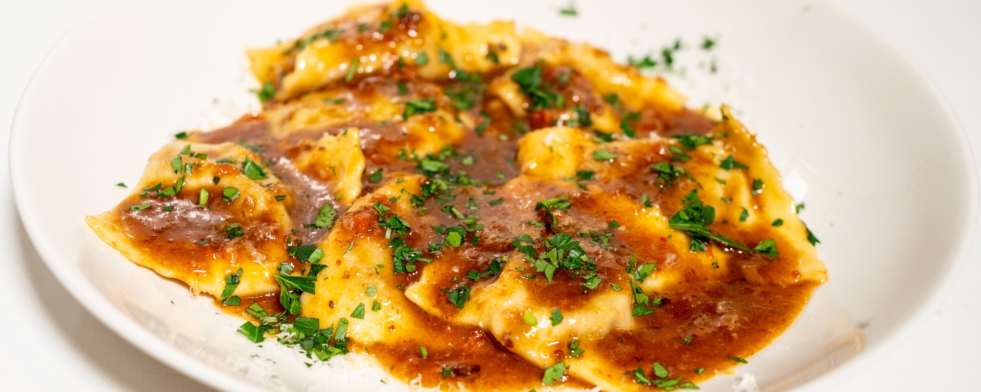 Coda alla Vaccinara is a classic dish from Rome that is oxtail stewed in tomato sauce with lardo, wine, garlic, and the holy trinity of Italian stews (onion, carrot, celery). Some recipes include more ‘exotic’ ingredients like raisins, pine nuts, cinnamon, cloves, and even cocoa powder. It can be served in two courses: starting with a primo piatto, pasta such as rigatoni with the sauce, followed by a secondo of the meat with some sauce. The traditional recipe and a sous vide version are already on my blog, as well as the primo piatto. For a more festive version, I decided to make ravioli with the meat as filling. I cooked the oxtail sous vide, but you could also cook it on the stovetop or in the oven and then follow the same procedure as I did to make the ravioli. To make the sauce even richer, I used the bones and other scraps to make a stock, reduced it, and added it to the sauce. You could also add the reduced stock to the filling, but I did not have time for that (as I was already folding the ravioli while the stock was still in progress). The dish is so rich that I would not recommend to serve this as a main course; a moderate portion is more enjoyable.