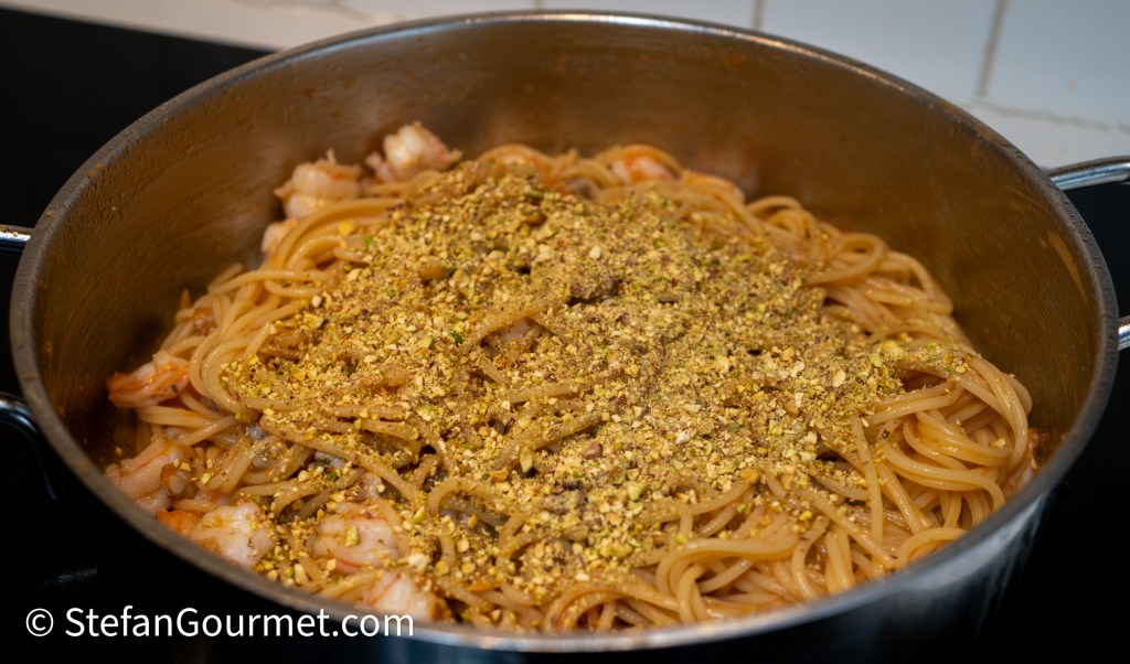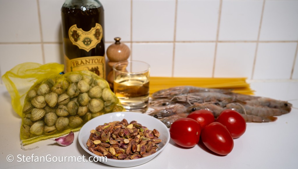 My friend Melvin had enjoyed Spaghetti V.G.P. at a restaurant in Sicily, and suggested we make prepare this. Pasta with vongole, gamberi (shrimp) and pistachios is quite common in Sicilian restaurants; it uses local ingredients and is a great flavor combination. All we had to go by was his memory and the description on the restaurant menu: “Vongole veraci e gambero rosa locale sfumati al vino bianco e leggermente colorati con salsa di pomodori e granella di pistacchio”, which translates to “Vongole veraci [clams] and local pink shrimp, deglazed with white wine and lightly colored with tomato sauce and ground pistachios”. Of course we used the flavor from the shrimp shells and the liquid from the vongole to make the sauce, and toasted the pistachios to augment their flavor. Because it was supposed to be only lightly colored with tomato sauce, I decided to use fresh tomatoes and only a small amount. The resulting dish was delicious.