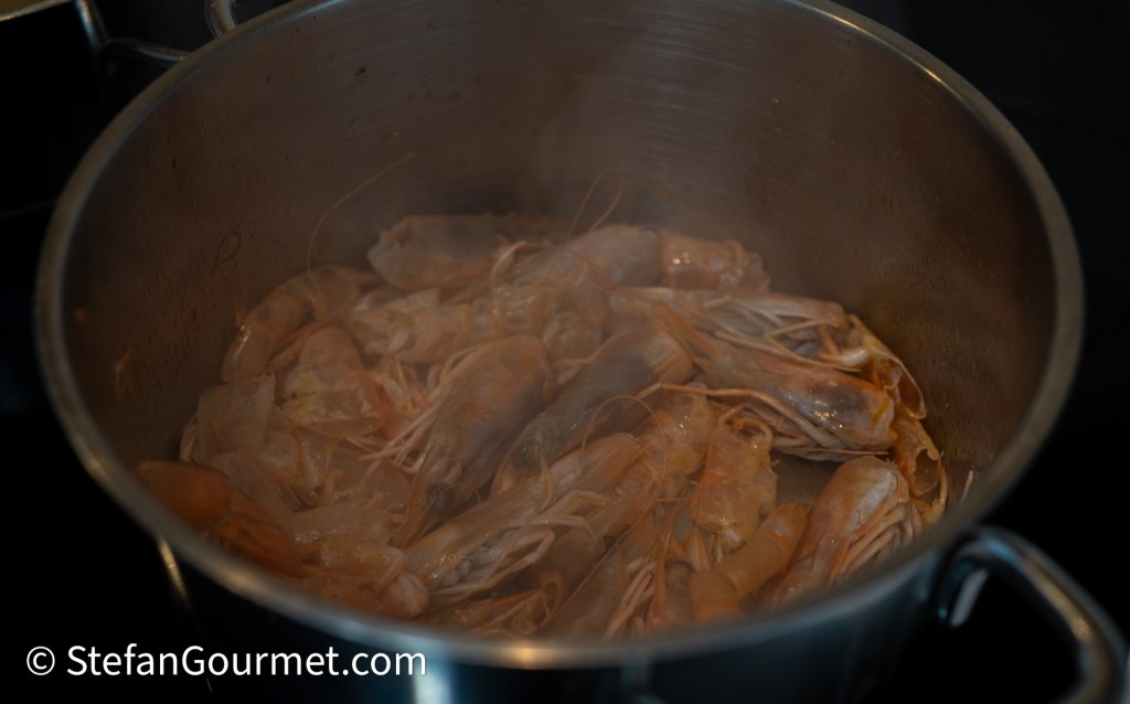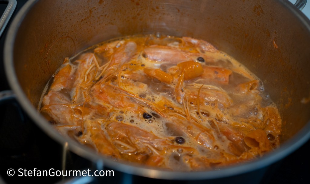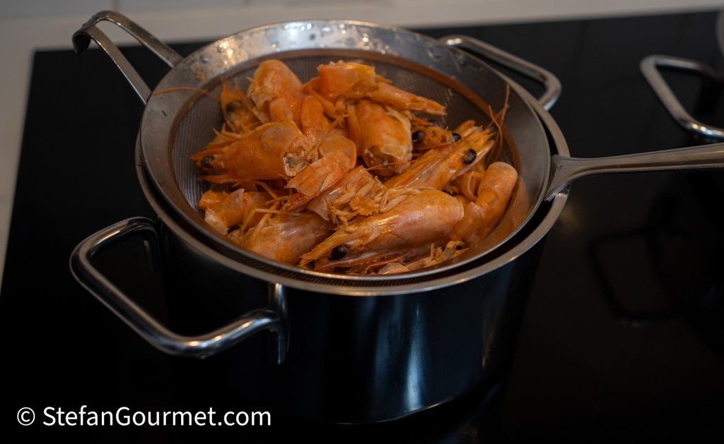When the shrimp stock is done, strain it through a sieve, pressing down on the shrimp heads to get all the liquid out. Discard the shrimp shells. (If you like you can reserve some shrimp heads for decoration.)