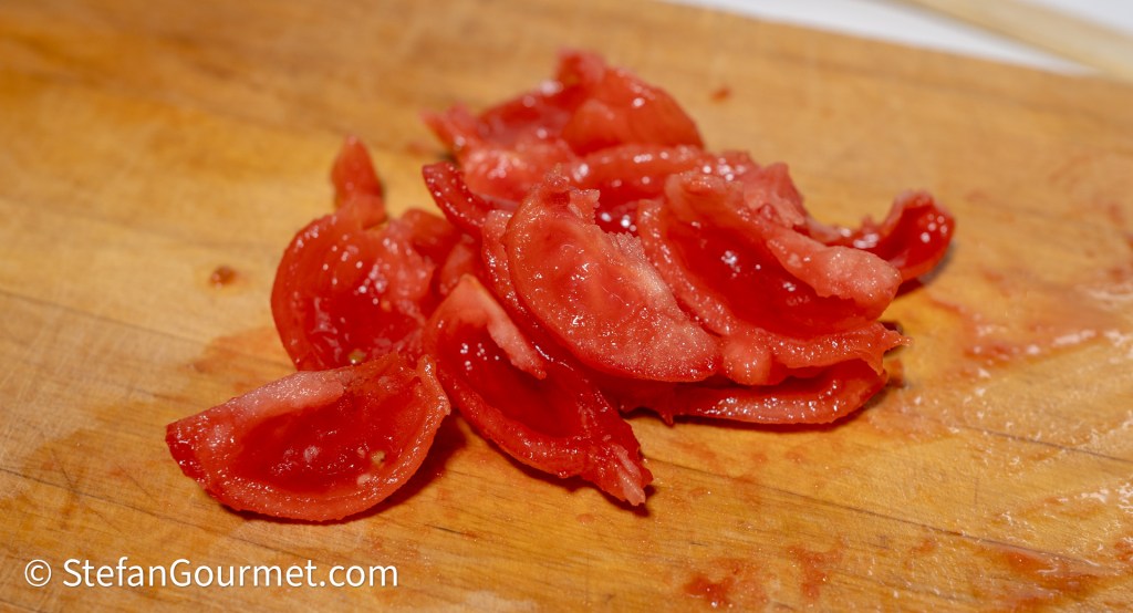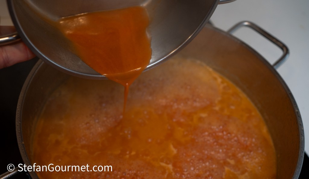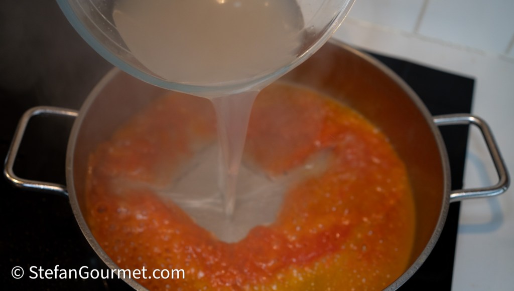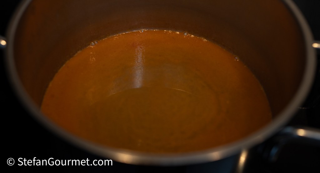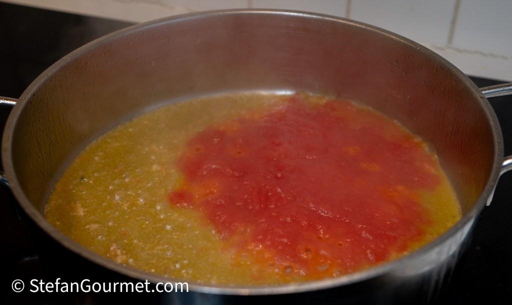 While the shrimp stock is simmering, peel the tomatoes and remove the seeds. The process for peeling the tomatoes is described in this post. Puree the tomatoes with a blender or food processor.