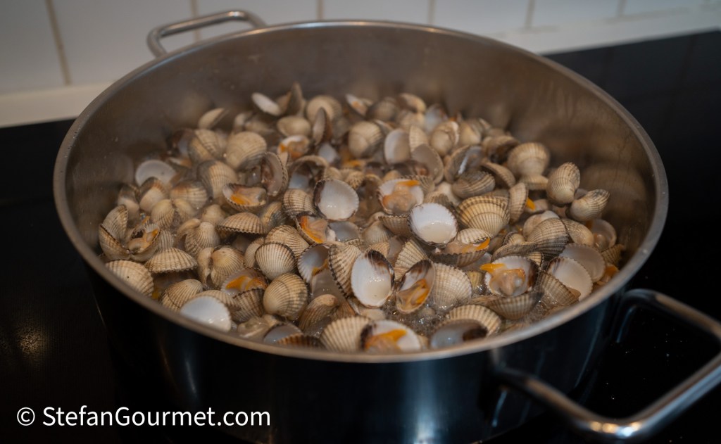 Drain the clams and submerge them in cold water without salt. Check if all the clams are closed, and discard any that are not. Drain the clams again and place them in a pan with 80 ml (1/3 cup) of dry white wine. Cover the pan, and put it over high heat until the clams have opened. Turn off the heat as soon as the clams have opened.