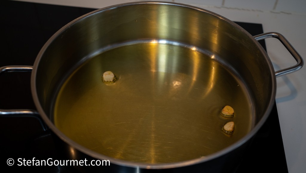 In the meantime, heat 3 tablespoons olive oil in a large frying pan. Slice the garlic thickly, and stir the garlic in the oil until the garlic is golden brown (tilt the pan to ‘deep fry’ the garlic and make this happen more quickly). Discard the garlic.