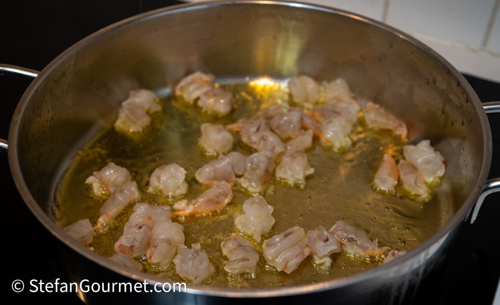 Peel and devein the shrimp. Season the shrimp meat with salt, place in a bowl, cover, and reserve in the refrigerator. Heat 1 tablespoon of oil in a pot in which the shrimp heads and shells fit snugly, add the shrimp heads and shells, and stir over medium-high heat until the heads and shells are orange.