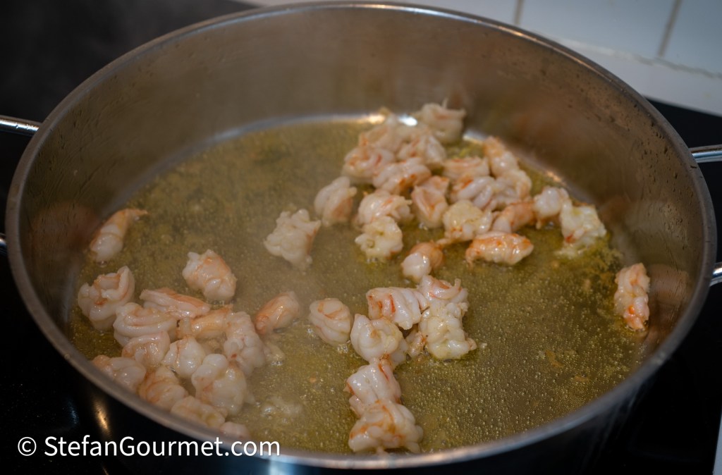 Pat the shrimp dry with paper towels, and add it to the frying pan with garlic-infused olive oil.