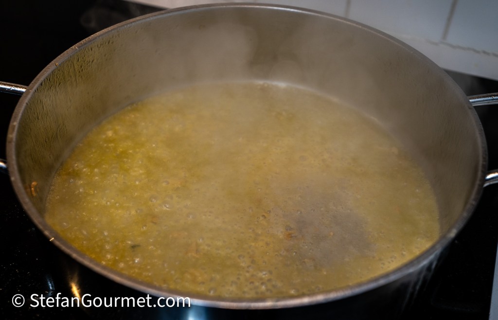 Then cover with water, cover the pan, and simmer gently for 20 minutes to make shrimp stock.