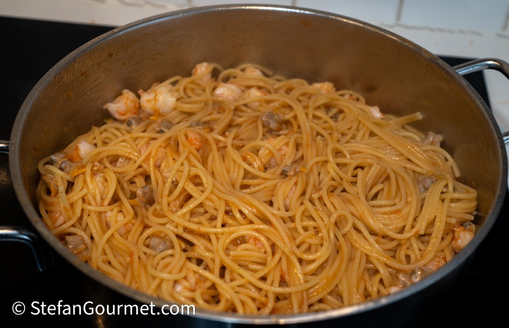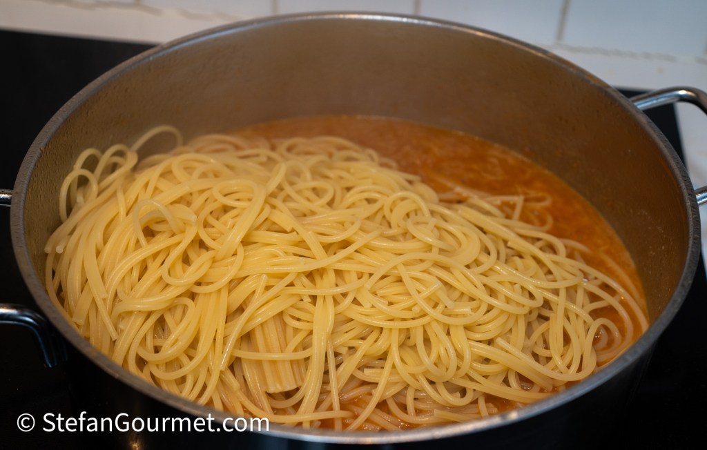 There is a bit of timing and heat management involved here, as there should be enough liquid left to finish cooking the spaghetti for 1-2 minutes in the sauce, but not so much liquid that it is still too soupy by the time the spaghetti is cooked. Use low heat if you think it may become too dry before the spaghetti is done, or high heat if you think there is too much liquid.