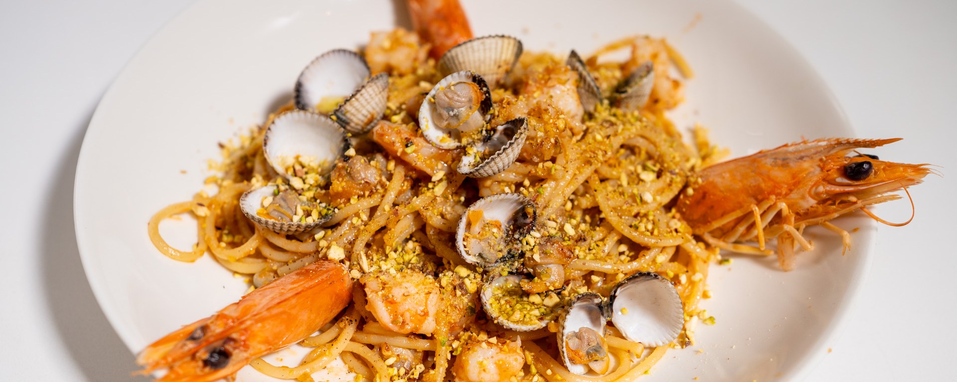 Serve at once on preheated plates, decorated with clams and sprinkled with the remaining ground pistachios. Finish with a drizzle of the best extra virgin olive oil you have, and some freshly ground black pepper.