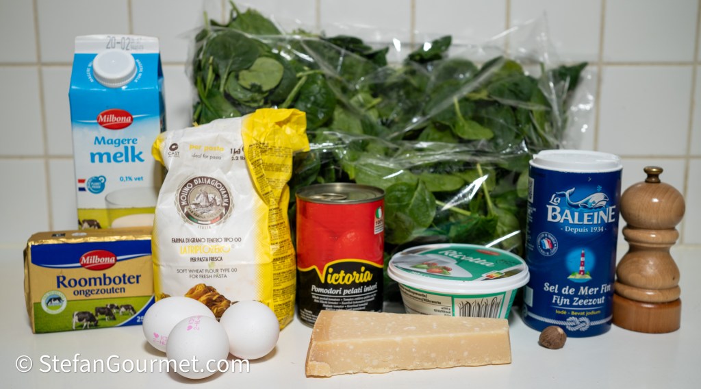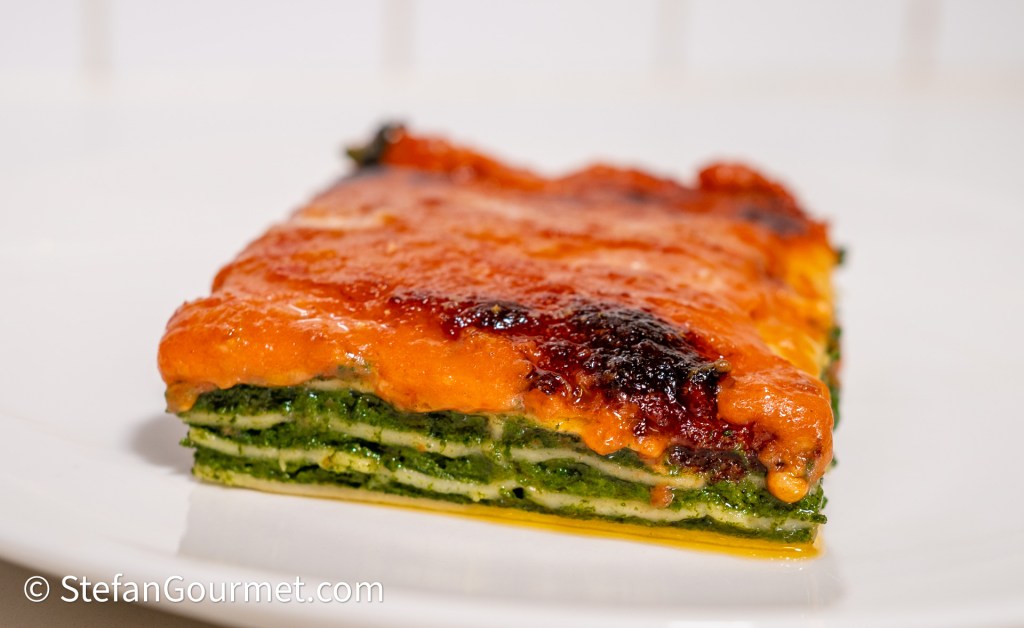 Ricotta and spinach are a classic combination in Italian cooking, especially as a stuffing for ravioli. It also works great with a ‘pink’ tomato sauce, which means a tomato sauce that is mixed with either cream or white sauce (besciamella). You could make ravioli stuffed with ricotta and spinach and serve them with such a pink sauce. Here I have turned it into lasagna instead. This is a very elegant dish (if you serve a modest portion) with a wondeful velvety flavor and texture.