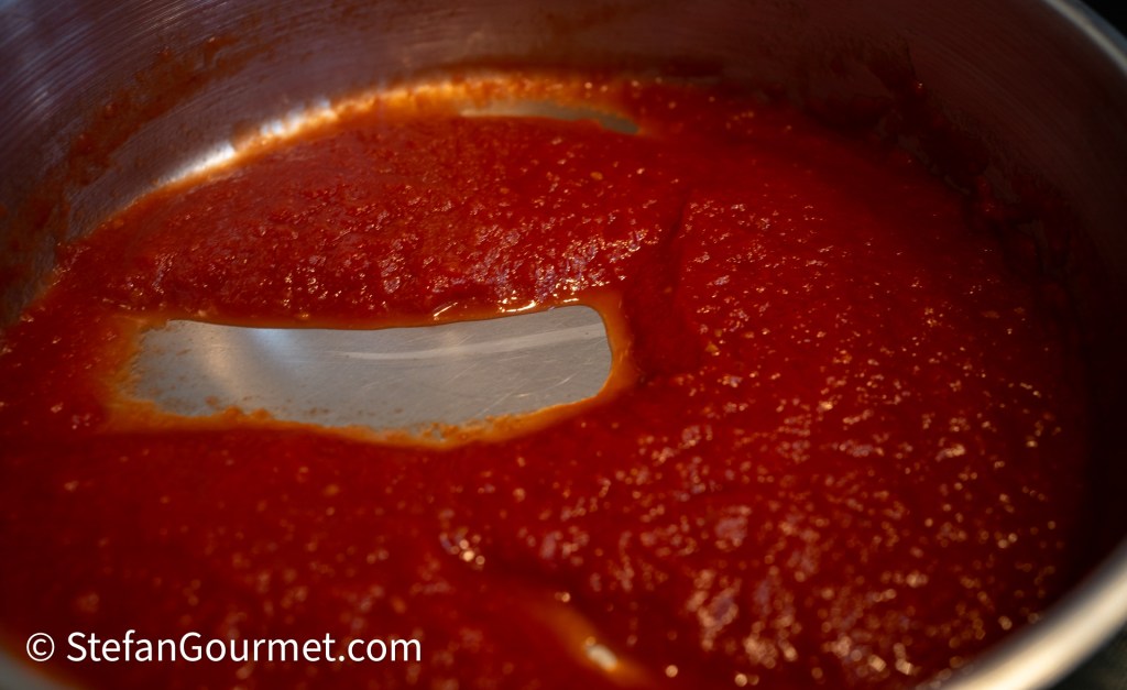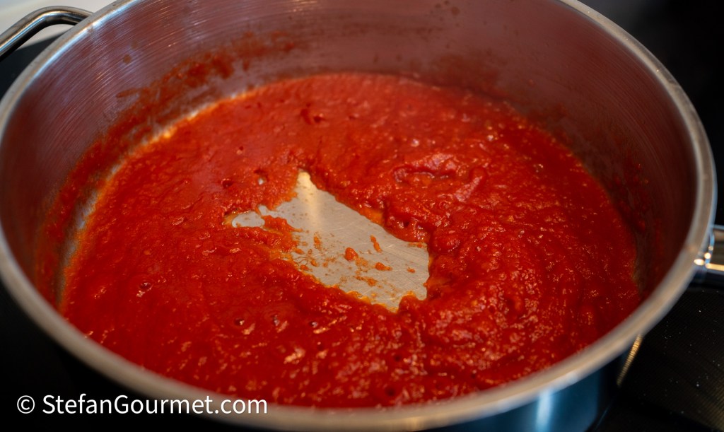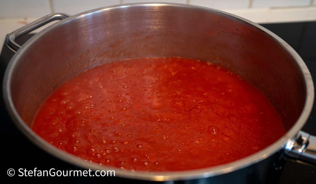 In the meantime, puree 400 grams of peeled tomatoes with their juices using a blender or food processor, and pour into a wide pan. Season with salt and freshly ground black pepper, ring to a boil, then simmer, stirring regularly…